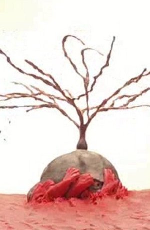 A fire has swept everything away. Wandering among the ashes, a single human is lost in thought.